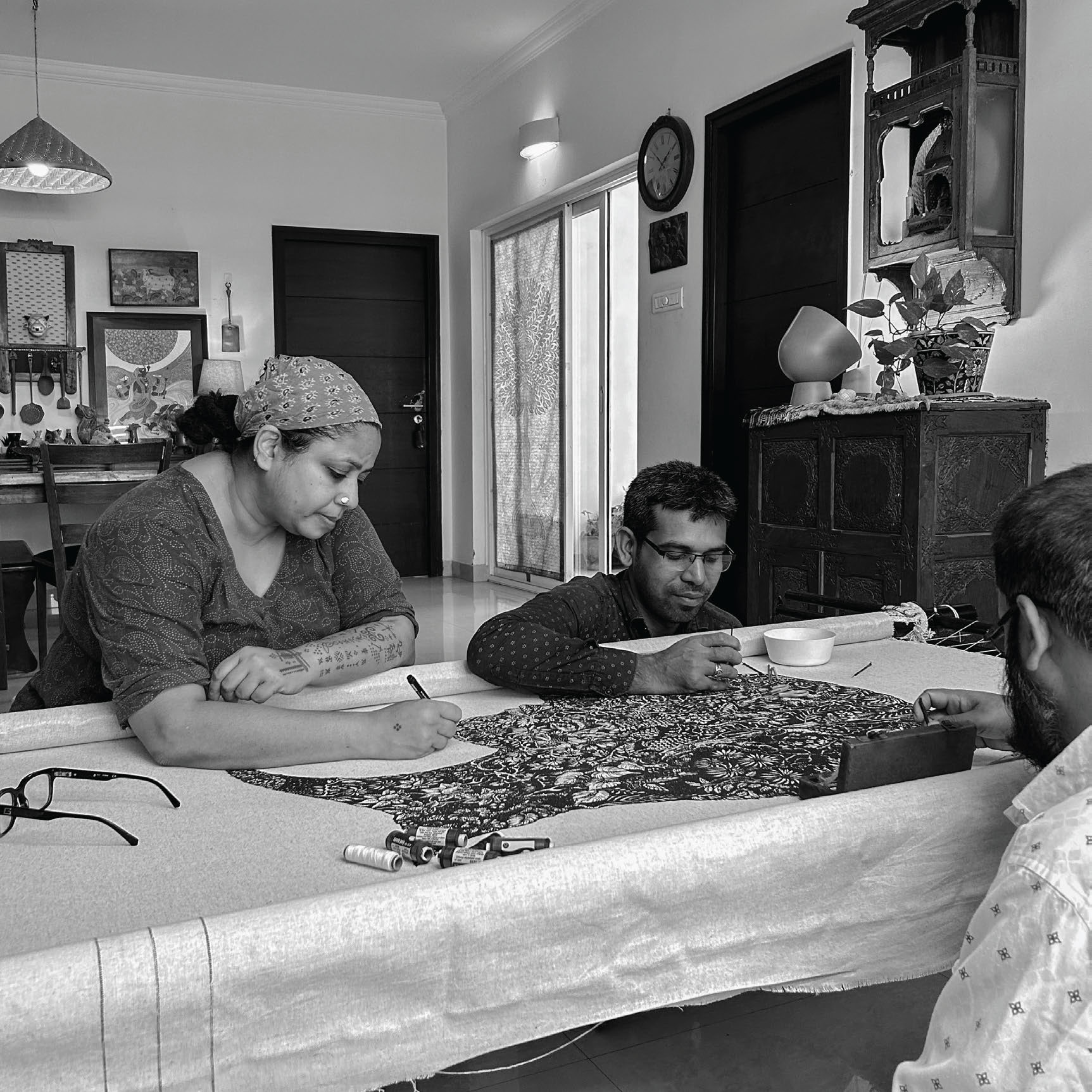 Aari hand-embroidery, also known as Khatla-work, is a remarkable textile art that utilizes a single hook-needle to create vibrant motifs on fabric stretched over a wooden frame. Varsha, a talented textile designer and pen-and-ink artist, masterfully combines traditional craftsmanship with contemporary design, drawing inspiration from Chintz, Gond art, and natural patterns. With over 30 years of experience and a background from NID Ahmedabad in Textile Design and Fine Arts, she has dedicated her career to preserving and advancing these age-old techniques. Her latest project, ‘Sutrākha,’ showcases the intricate beauty of Khatla embroidery, exemplifying the artistry of Aari handwork while seamlessly blending it into modern art and lifestyle products.
